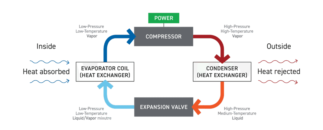 - The evaporator absorbs heat from the surrounding air, cooling the space. The refrigerant turns back into a gas and returns to the compressor, repeating the cycle.